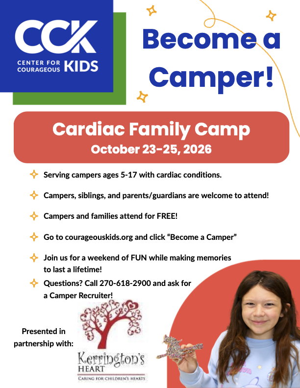 We are partnering with the Center for Courageous Kids to provide 30 Kentucky CHD kids with the opportunity to have a “normal” childhood experiences just as their friends have but in a medically safe environment. This camp is for the whole family and FREE!